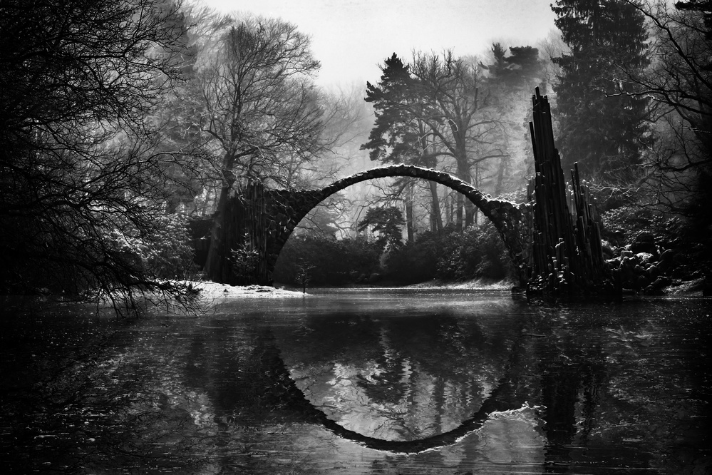 I noticed this place on 500px a couple of years ago, the real name is Rakotz Bridge. It’s very obvious why photographers love it and I wanted to have it, too. It’s not exactly close to my home, Munich, it’s a 400km drive. Starting from Munich, it’s not really possible to be there at sunrise without starting in the middle of the night. My girlfriend, photographer herself (many things I do wouldn’t work if she was not), had some business in Goerlitz, a neat town close to it, literally on the Polish Border. It was December, and most of the really good pictures of this bridge were done in autumn, golden leafs, the dreamy version. But honestly, does the surname “Devil’s Bridge” remind you of something neat, harmonic, like most pictures are? I loved the idea of doing it in winter, morning dusk, dark and mystical. So we decided to get that bridge finally.