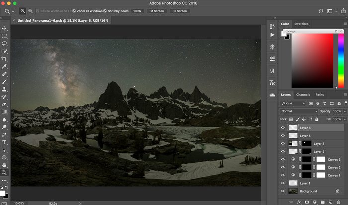 The other critical adjustment was to selectively increase the brightness and contrast of the mountain walls and the Milky Way centre, using a similar way described above, such that more subtle details of these parts were naturally highlighted.